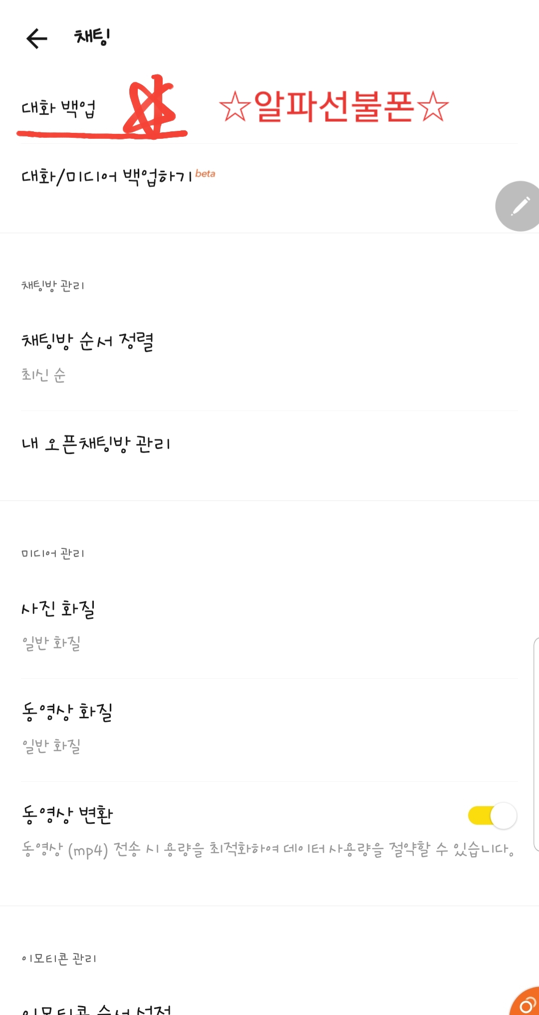 전체설정에서 채팅 그리고 대화백업만 하면 되요