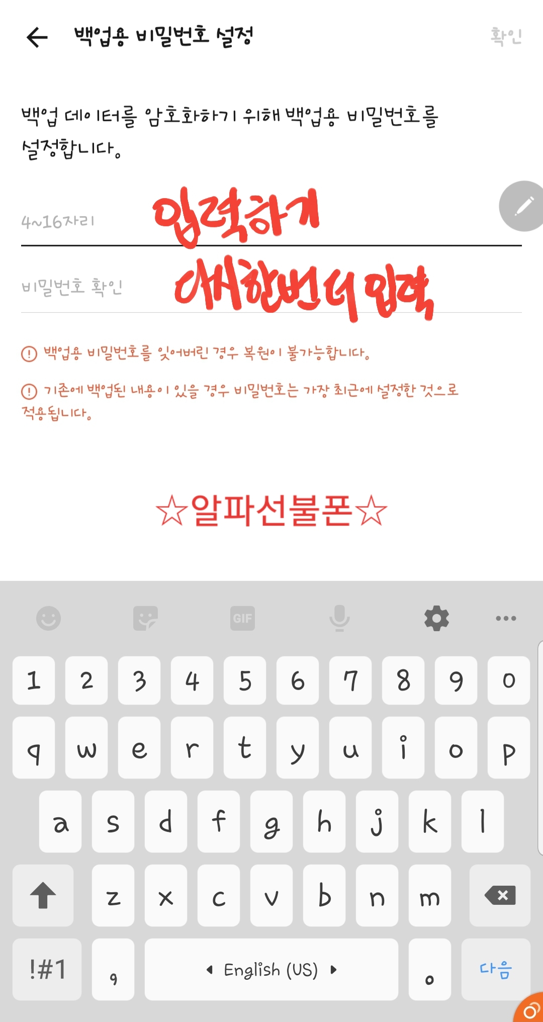 기존에 백업된 내용이 있을 경우 비밀번호는